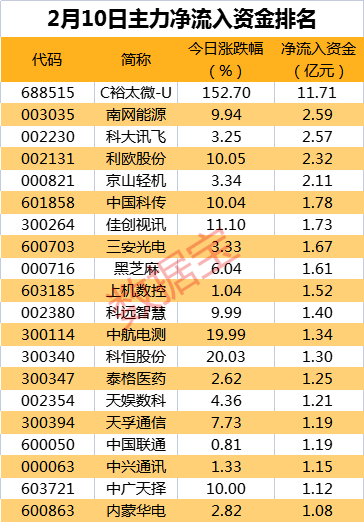 从个股来看,共有5股主力资金净流入超2亿元,C裕太微-U主力资金净流入11.71亿元居首,该股为今日上市新股,今日涨幅152.7%,发行价92元,开盘即飙涨180%,最高上涨191.3%。如果按照最高价268元计算,中一签(500股)可大赚8.8万元,为近年少见的“肉签”。
