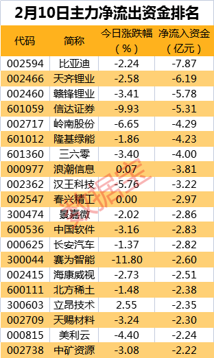 主力资金净流出个股中,比亚迪(002594)遭净卖出7.87亿元,流出金额居首。其次是天齐锂业(002466)、赣锋锂业(002460)、信达证券,净流出资金分别为6.19亿元、5.78亿元、5.31亿元。