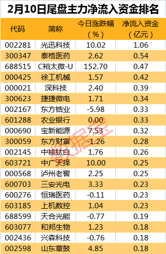 从个股看,9股尾盘净流入资金超3000万元,光迅科技(002281)获主力尾盘抢筹1.06亿元居首。其后,泰格医药(300347)、C裕太微-U获尾盘主力抢筹金额居前,分别为0.54亿元、0.47亿元。